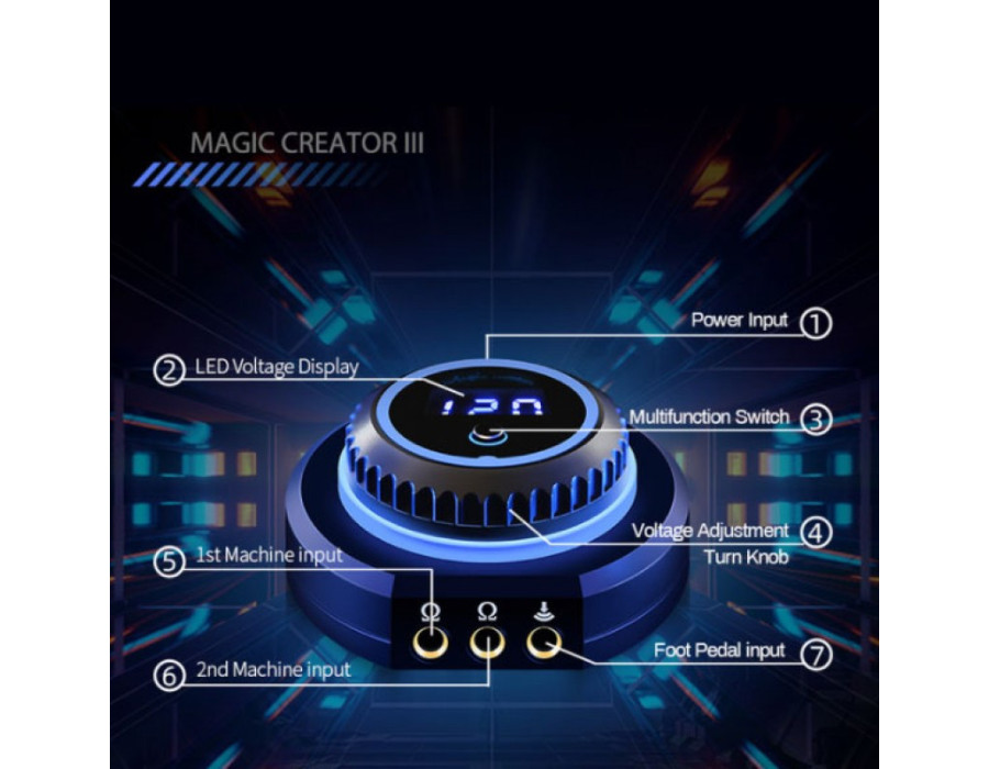 Блок живлення Magic Creator III оснащений цифровим дисплеєм з підсвічуванням, магнітним індукційним циферблатом напруги і синіми світлодіодами, що світяться і пульсують при використанні.