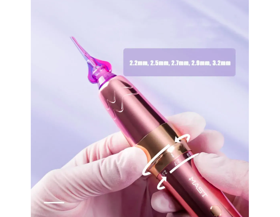 - П’ять варіантів ходу голки: 2,2 мм, 2,5 мм, 2,7 мм, 2,9 мм, 3,2 мм — під різні техніки (губи, брови, міні-тату).