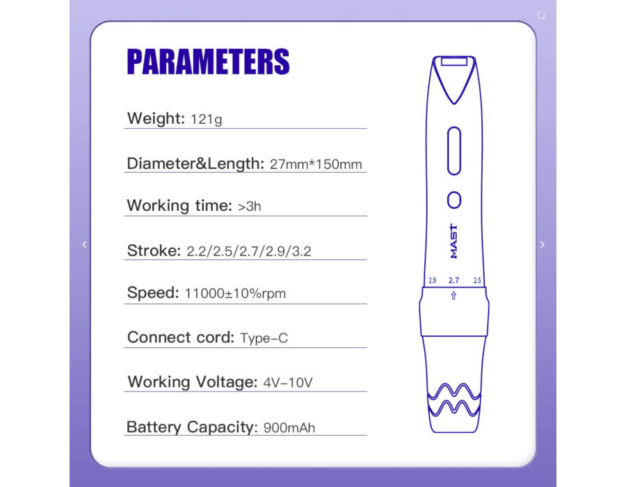 Mast P60 — інноваційне рішення для майстрів татуажу та ПМ: елегантний дизайн, багатофункційність і сучасні технології. Підходить для створення ідеальних брів, губ і невеликих татуювань завдяки регульованим довжинам ходу голки. Ергономічна форма та мала вага гарантують комфорт під час тривалих сесій.