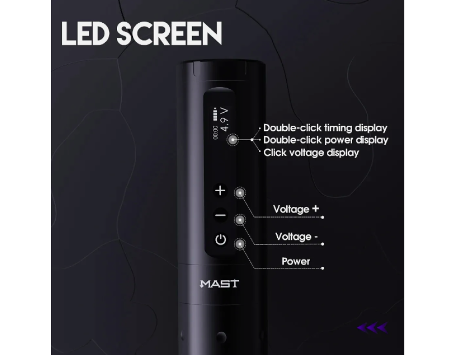 Mast A2 Wireless PMU Tattoo Pen — це професійна бездротова тату-машинка, яка поєднує потужність, тривалу автономну роботу, широку сумісність із картриджами та інтуїтивне керування. Створена для майстрів, які цінують стабільність, комфорт і максимальний контроль над процесом.