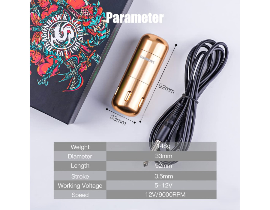 Dragonhawk Rotary Tattoo - машинка у формі ручки, яка забезпечує м’які штрихи при низькій напрузі або сильніші, потужніші штрихи при напрузі вище 6 В.