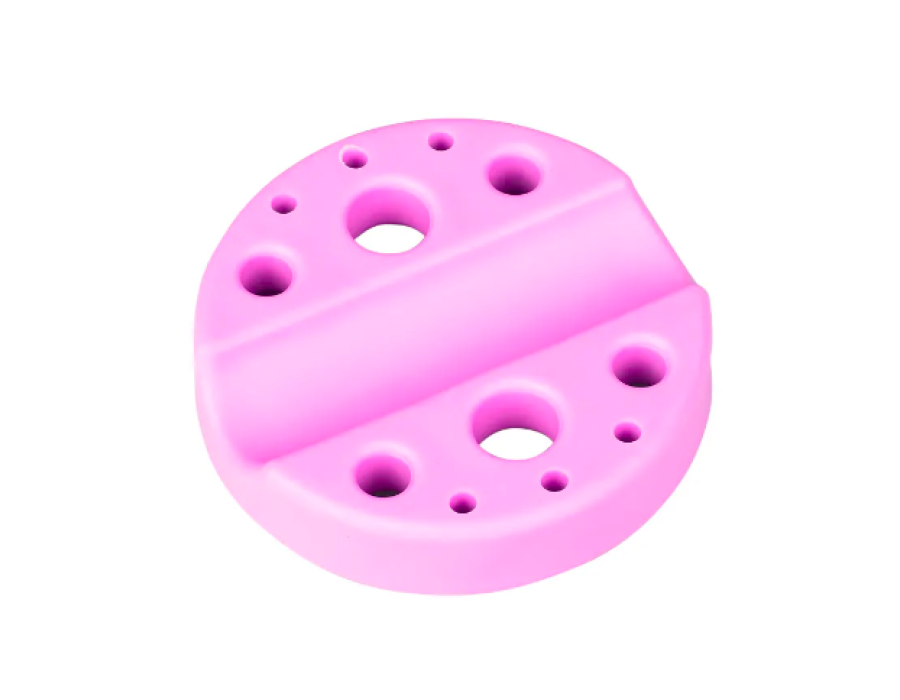Має отвори різного діаметра. Дуже зручна для кольорових робіт. Рекомендуємо для тих, хто любить самостійно змішувати пігменти. Завдяки підставці Вам не потрібно заставляти робоче місце фарбами різних кольорів, а лише необхідно налити її в ковпачки і кілька кольорів у Вас під рукою. Підставка має поглиблення для зручного розташування тату машинки, комірки для капсів з пігментом та маленькі отвори для мікробрашів та інших дрібних деталей.