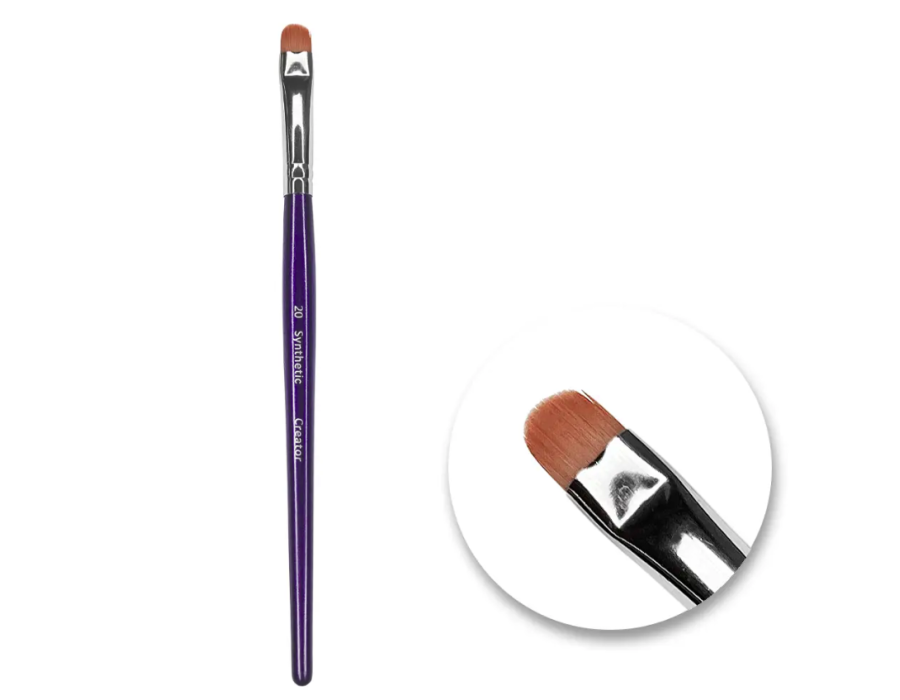 Пензель №20 від бренду Creator Synthetic - багатофункціональний плоский, синтетичний пензель з м'якими краями. Ідеально підходить для формування основної деталі в техніці олівця макіяжу. Підпорядкування та формування чітких ліній як у макіяжі, так і при роботі з бровами.