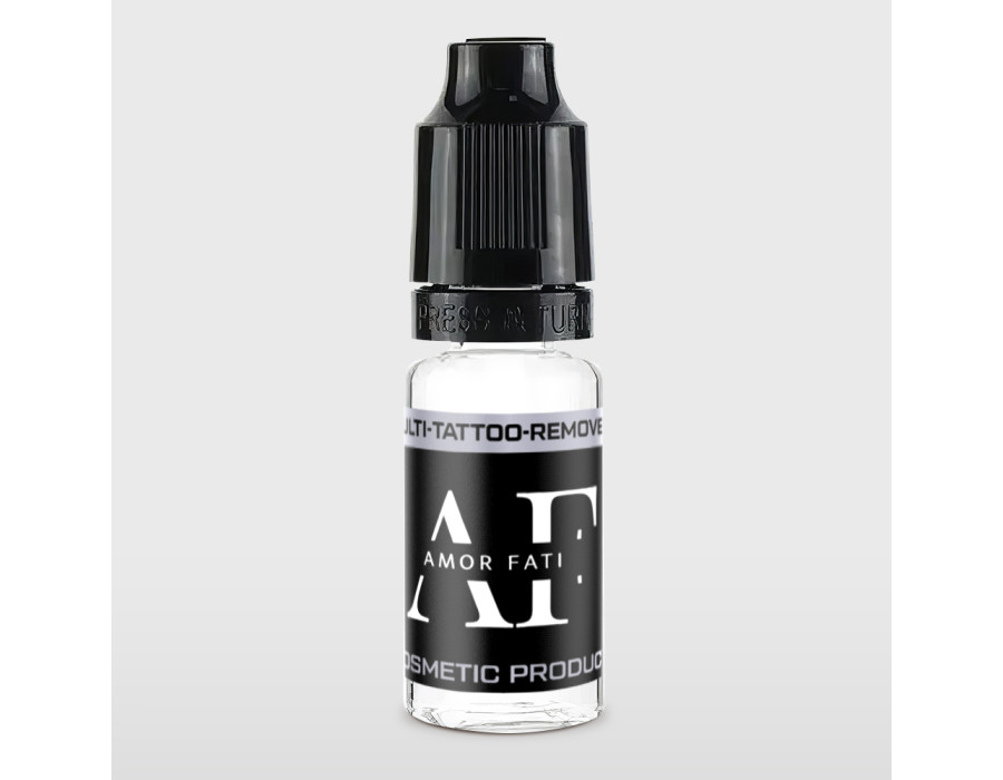 Мультикислотний ремувер MULTI-TATTOO-REMOVER 10 ml AMOR-FATI для видалення тату та перманентного макіяжу Засіб для видалення перманентного макіяжу MULTI-TATTOO-REMOVER ідеальний для освітлення та виведення неякісного та набридлого татуажу. Він ефективний і безпечний, підходить як для майстра-початківця, так і для професіонала. У складі містяться спеціальні речовини, які глибоко впливають на пігмент, що фарбує, а після його використання не залишають рубців і шрамів. Загальні відомості про засіб MULTI-TATTOO-REMOVER AMOR-FATI Для нанесення перманентного макіяжу майстер використовує спеціальні сполуки – оксиди заліза чи хрому, діоксид титану та інші неорганічні метали. Такі речовини мають підвищену стійкість до органічних розчинників та води, завдяки чому татуаж не втрачає колір, залишаючись під шкірою тривалий час. Раніше процес виведення пігменту був досить болючим, а лазер залишав помітні рубці. Щоб швидко та безболісно вивести перманентний татуаж, було розроблено спеціальний склад. Виробники врахували всі особливості та тонкощі процедури освітлення та видалення, тому ефект від використання вийде колосальним.