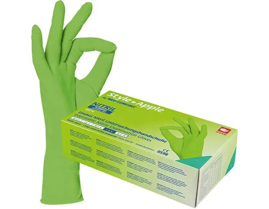 Одноразові рукавички виготовляються на заводі Top Glove Sdn Bhd (Німеччина) – одному із найбільших виробників у світі. Виготовлені із штучного матеріалу нітрилу, що робить їх абсолютно гіпоалергенними. Вироби відрізняються високою стійкістю до впливу хімічних речовин (розчинників, олій, олій, жирів, розчинів). Завдяки м'якості та еластичності нітрилові рукавички м'яко облягають руку, забезпечуючи високий комфорт проведення різноманітних маніпуляцій та процедур.