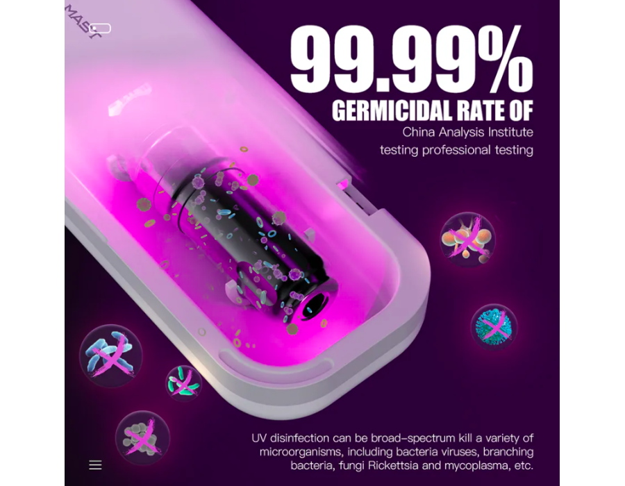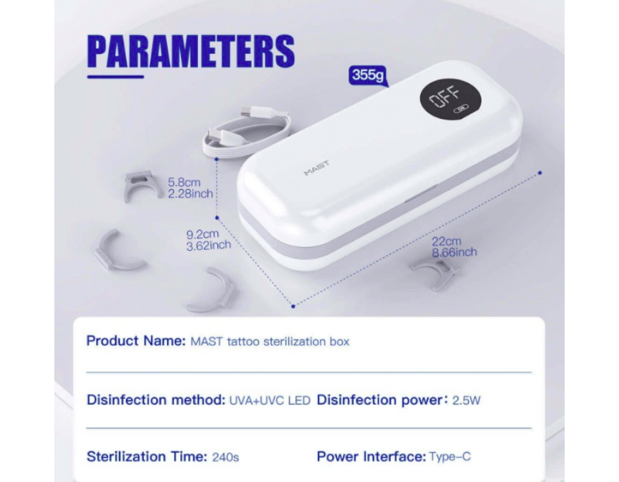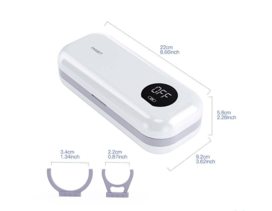 - Портативний стерилізаційний бокс із УФ-освітленням – розміри корпусу: 22 см * 9,2 см * 5,8 см; Рівень бактерицидності УФ-дезінфекції 99,99%, що дозволяє знищувати широкий спектр мікроорганізмів, включаючи бактерії, віруси, ветвисті бактерії, гриби, рікетсії, мікоплазми та інше.