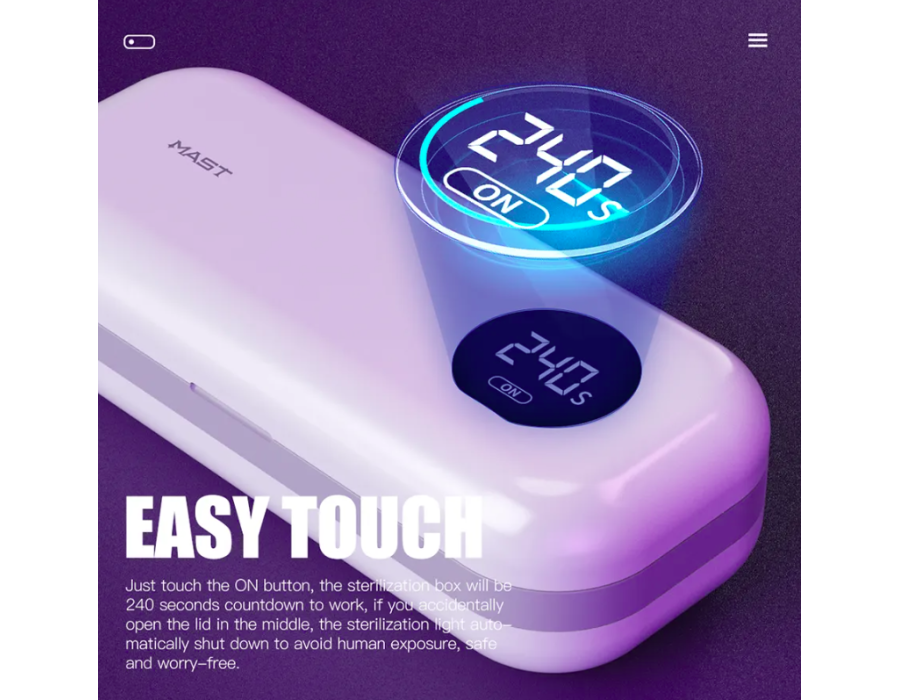 - Захист від автоматичного відключення – просто натисніть кнопку "Увімкнути", і стерилізаційний бокс розпочне зворотний відлік 240 секунд. Якщо ви випадково відкриєте кришку посередині процесу, стерилізація автоматично відключиться, щоб уникнути впливу на людину - це безпечно та без проблем.
